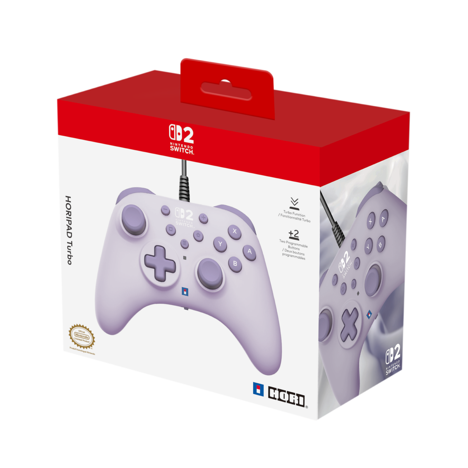 Explore new Nintendo game worlds and levels with the HORIPAD Turbo for Nintendo Switch™ 2 in Cozy Lavender. This sturdy, ergonomic controller boasts an array of features including programmable rear buttons, precision analog sticks, Turbo settings and more. Assign functional to change button functions freely to customize your play experience! Wired functionality provides lightning-fast responses and tournament-ready performance, while an ergonomic grip and a lightweight profile ensure continued comfort. Connect to your system through the USB-A 9.8 ft cable. Compatible with Nintendo Switch™ 2, Nintendo Switch™ and Nintendo Switch™ – OLED Model. Officially licensed by Nintendo®.