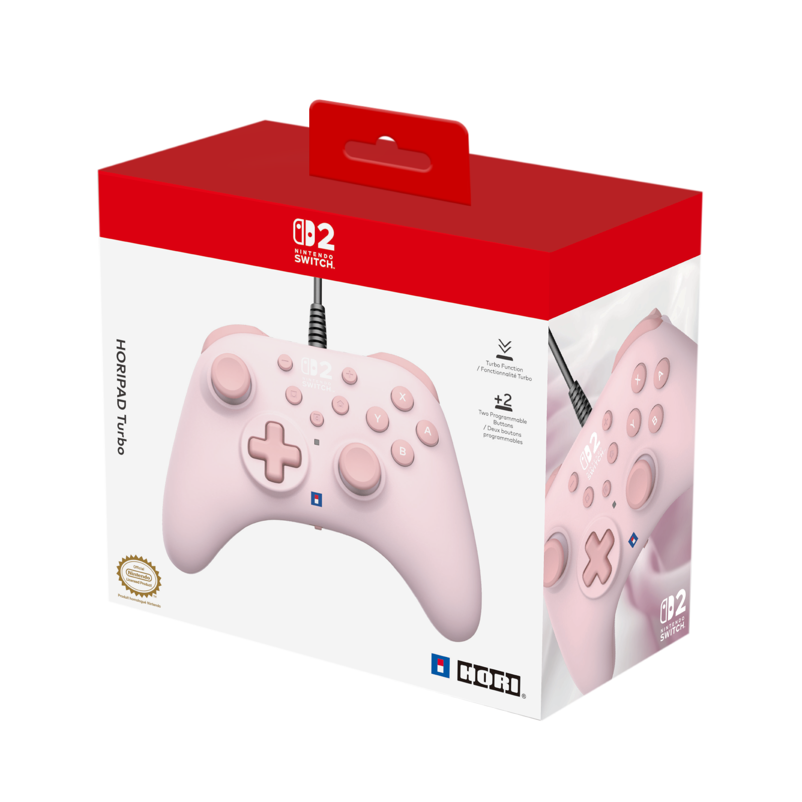 Enjoy plenty of Nintendo gaming sessions with the HORIPAD Turbo for Nintendo Switch™ 2 in Cozy Pink. This sturdy, ergonomic controller boasts an array of features including programmable rear buttons, precision analog sticks, Turbo settings and more. Assign functional to change button functions freely to customize your play experience! Wired functionality provides lightning-fast responses and tournament-ready performance, while an ergonomic grip and a lightweight profile ensure continued comfort. Connect to your system through the USB-A 9.8 ft cable. Compatible with Nintendo Switch™ 2, Nintendo Switch™ and Nintendo Switch™ – OLED Model. Officially licensed by Nintendo®.